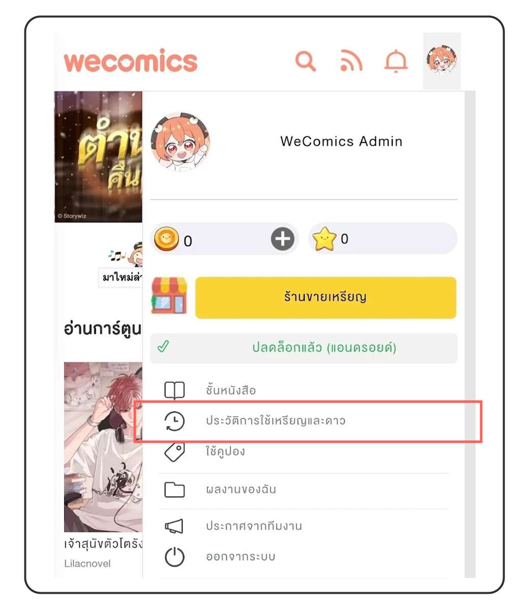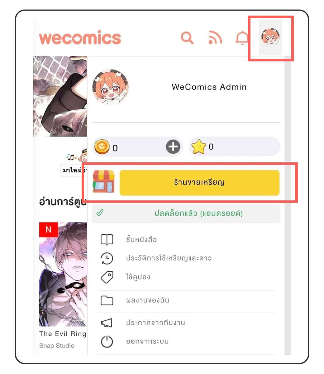 1. ขั้นตอนแรก เข้าเว็บไซต์ www.wecomics.in.th ล็อกอินเข้าสู่ระบบ แล้วคลิกที่รูปโปรไฟล์มุมขวาบน จากนั้นเลือกเมนู ร้านขายเหรียญ