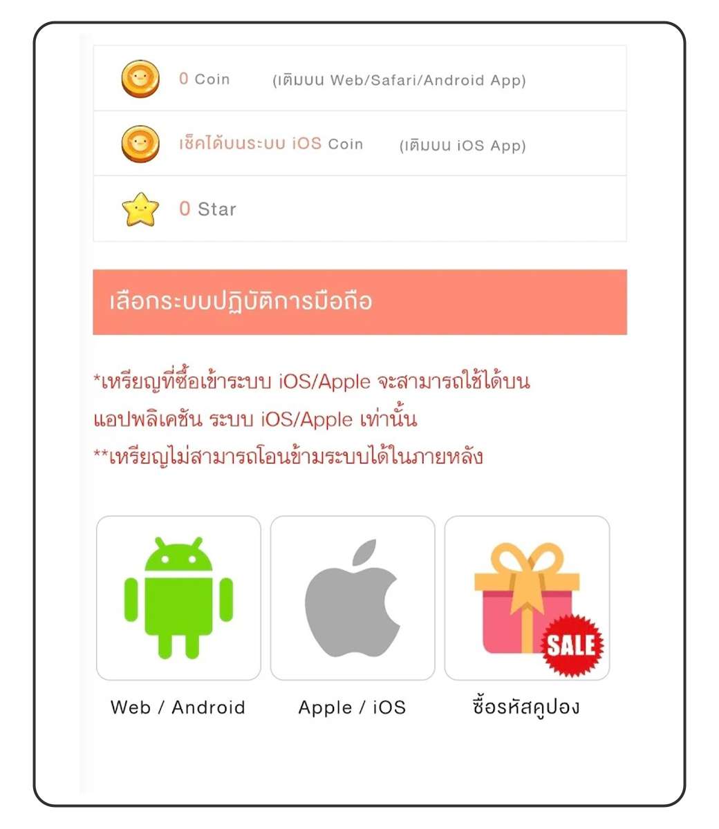 2. เลือกระบบปฏิบัติการที่ต้องการเติมเหรียญ (เหรียญบนระบบ Android และเว็บไซต์ จะไม่สามารถใช้ร่วมกับระบบ iOS ได้)