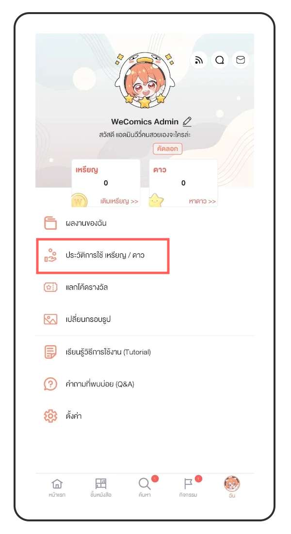 1. ขั้นตอนแรก ล็อกอินเข้าสู่ระบบ WeComics ไปที่หน้า ฉัน จากนั้นเลือกเมนู เติมเหรียญ