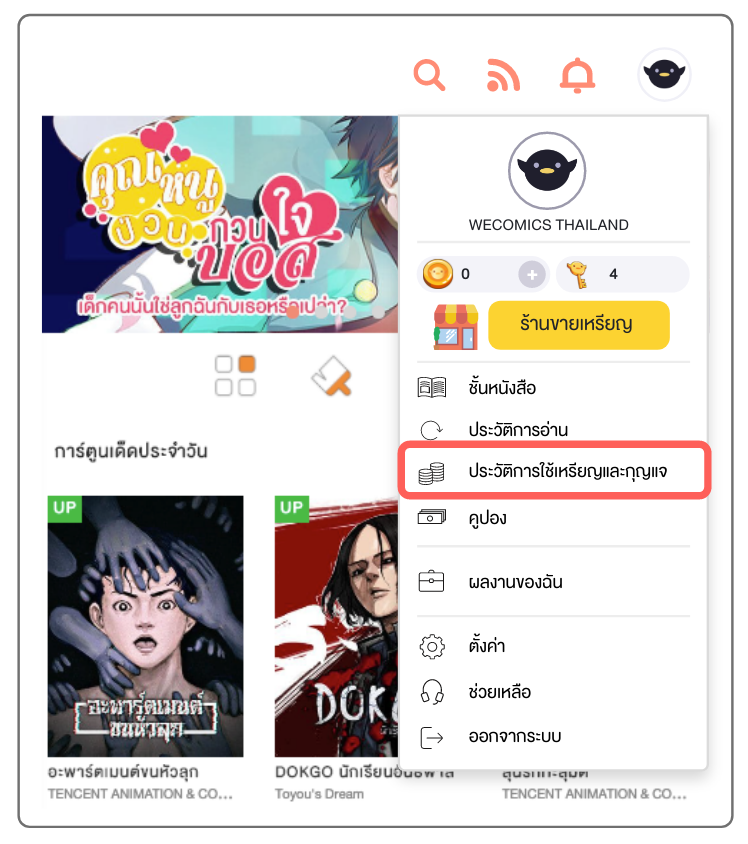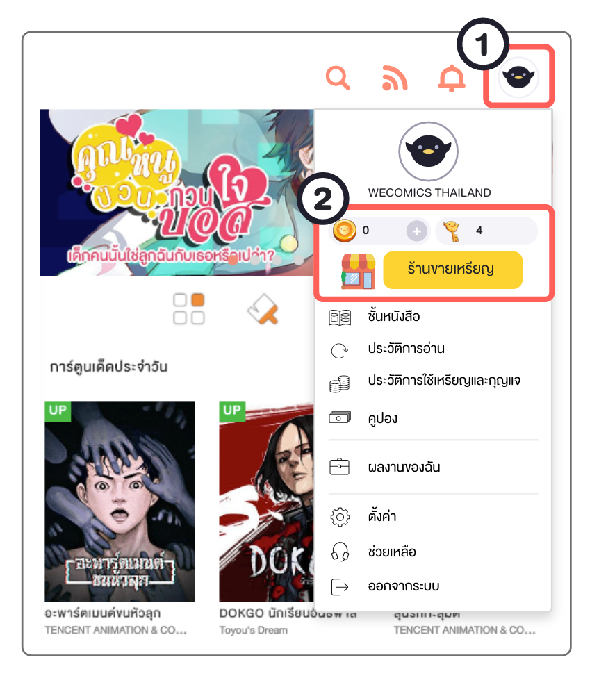 ขั้นตอนแรก ให้เพื่อนๆ Login เข้าสู่ระบบ WeComics แล้วคลิกที่ รูปโปรไฟล์ จากนั้นคลิกที่ ร้านขายเหรียญ