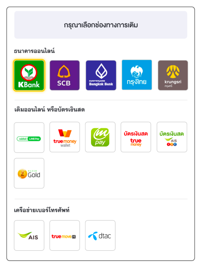จากนั้นระบบจะแสดงหน้าร้านขายเหรียญ และ ช่องทางการเติมเหรียญ ให้เลือกมากมาย เพื่อนๆสามารถเลือกจ่ายตามที่สะดวกได้เลย