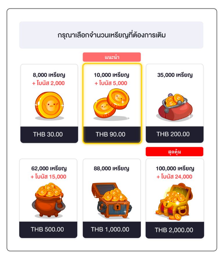 จากนั้นระบบจะแสดงจำนวนเหรียญที่สามารถเติมได้ เมื่อเลือกจำนวนที่ต้องการเติมได้แล้ว คลิก “ชำระเงิน”
